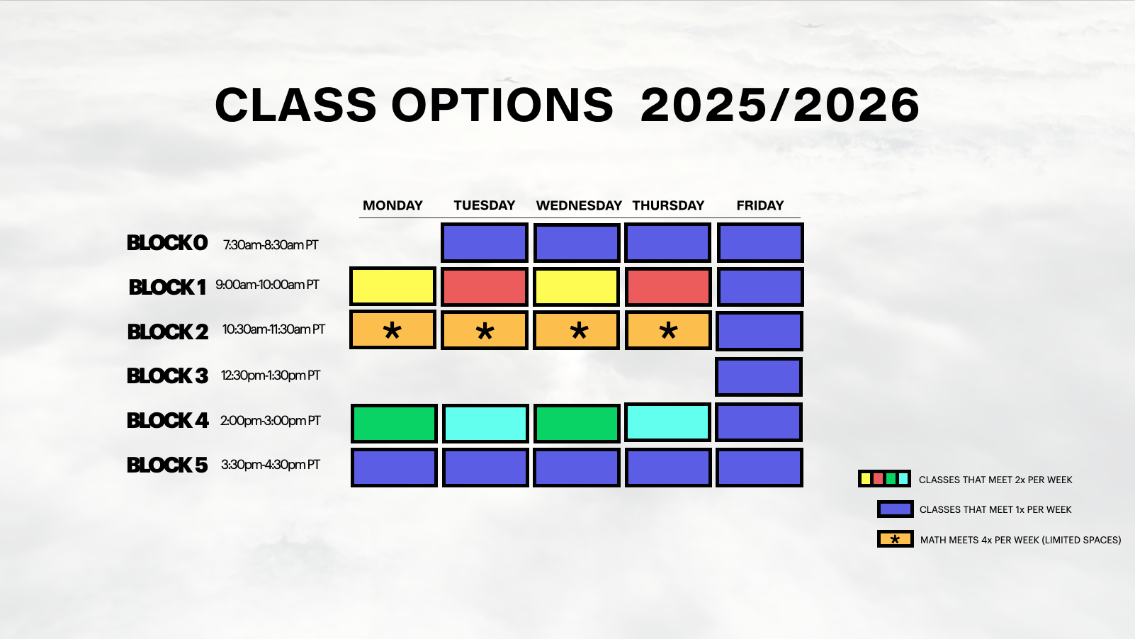 Astra Nova students can configure blocks that suit their schedule for the school year. Math (pre-algebra through pre-calculus) is held in Monday through Thursday in BLOCK 2 and is subject to availability.